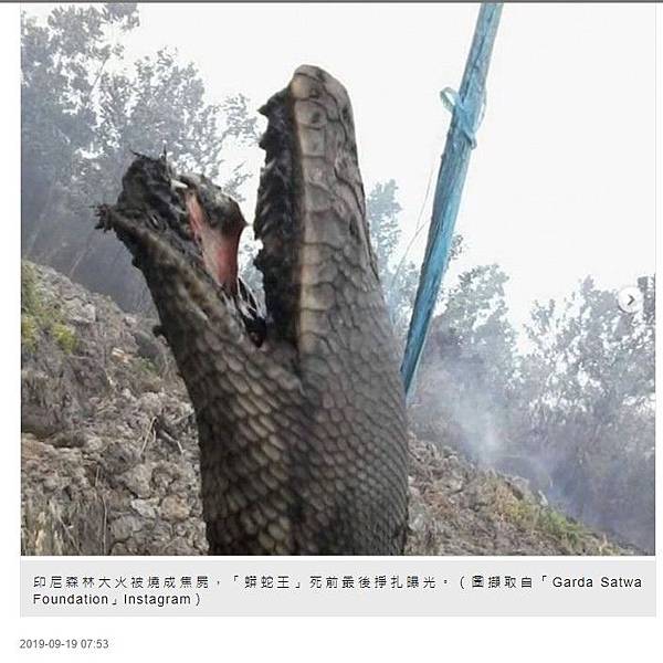 綜合媒體報導,印尼農民「火耕」整地,由於氣候乾燥,導致引發森林大火,不止霧霾嚴重,很多野生動物棲地也遭到破壞,Garda Satwa Foundation表示,除了蟒蛇王被燒死外,在另外一個森林大火現場,也發現3條巨蟒被燒成焦屍。