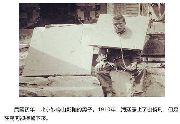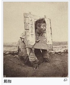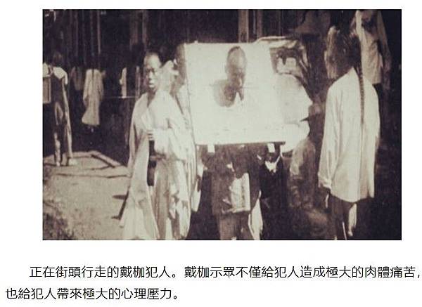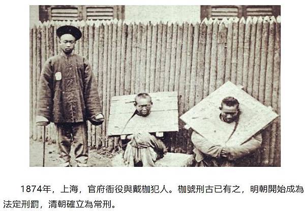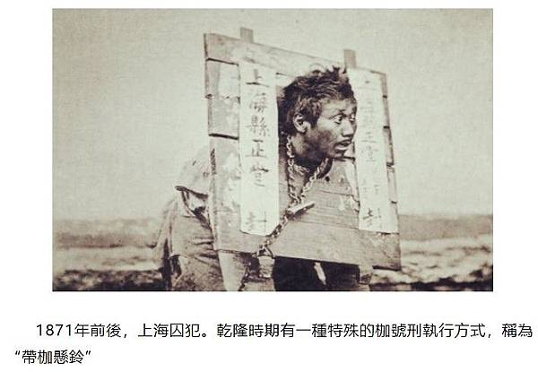枷號與監內戒護性質的帶枷不同,它是在監外帶枷示眾並揭露犯人罪狀的一種刑罰。清朝時,枷號常被用來懲治事關倫常、風化的犯人,即讓犯人帶枷立於衙門口或公共場所,既處罰、羞辱犯人,又教訓警戒他人。這張圖片是被上海縣衙判處枷號的犯人。