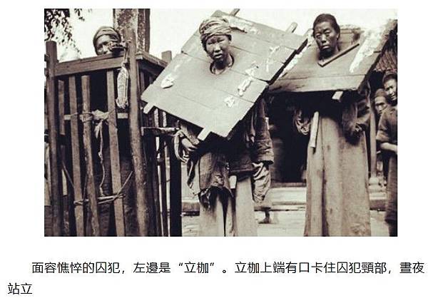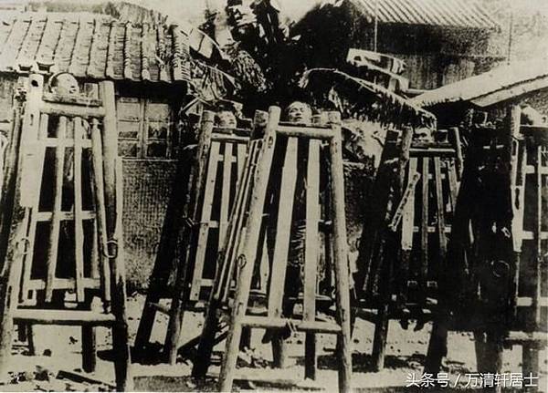 圖為被判處站籠的一組犯人,從犯人面部的痛苦表情可知,他們被執行的是懸空站籠死刑。