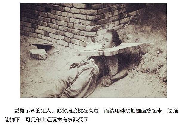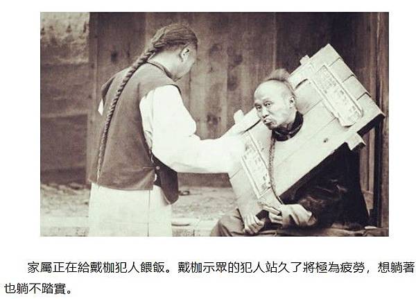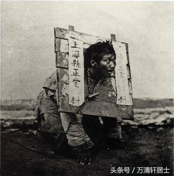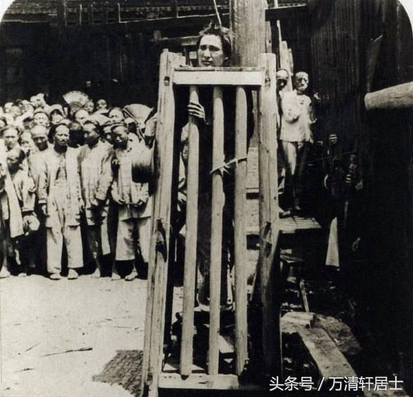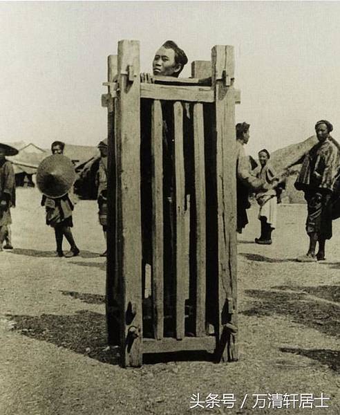 清朝時,浙江等省有獄卒創立木籠站囚之制。即用木製籠,籠頂開個圓孔,套在頸部,使人晝夜直立,以致疲勞過度而死亡;或套枷時在腳下設置墊物,套定後抽去墊物,使人懸空致死。圖為1900年6月,美國人詹姆斯·理查頓在上海街頭拍攝的「站籠」照片。