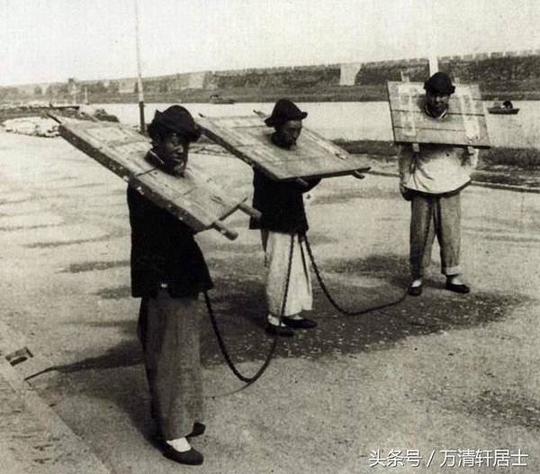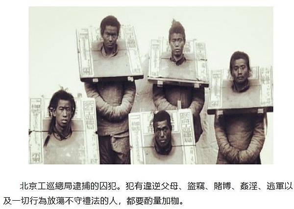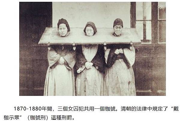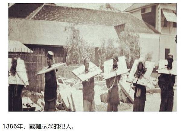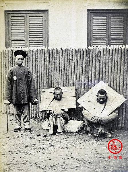 圖為晚清時被判處枷號,且被聯鎖在一起的三個犯人。