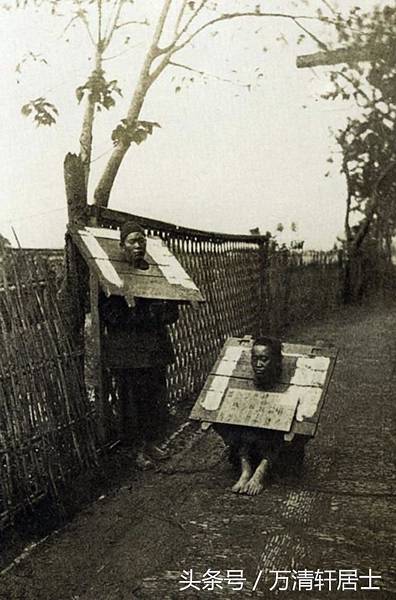 「鎖」即鐵索、鐵鏈,也是中國古代的刑具之一。據史書記載,西漢時已開始用「鎖」;南北朝以後,歷代對於鎖的規格和使用都有規定。在中國古代社會,將犯法者「示眾」是一種帶有羞辱意味的刑罰。從當時的社會環境來說,那個時代的「示眾」確實起到了教育民眾、預防犯罪的作用。而這樣的刑罰工具主要為枷鎖與站籠。圖為清朝被判處枷號並被聯鎖在一起的兩名犯人。
