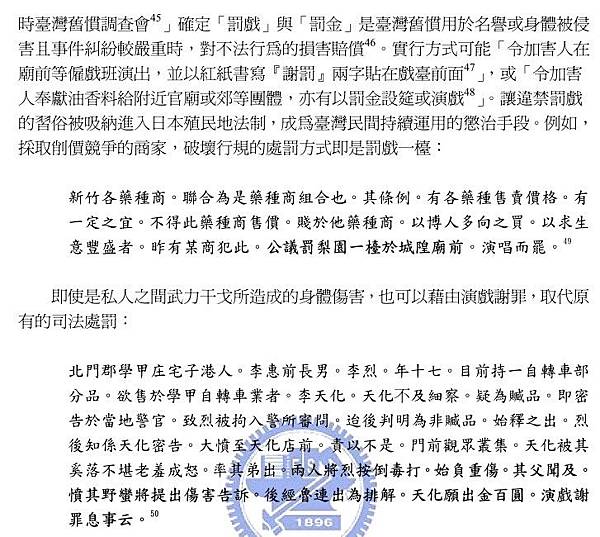 違禁罰戲-以紅紙書寫『謝罰』兩字貼在戲臺前面--臺灣舊慣調查會 」確定「罰戲」與「罰金」是臺灣舊慣用於名譽或身體被侵害且事件糾紛較嚴重時,對不法行為的損害賠償 。實行方式可能「令加害人在廟前等僱戲班演出,並以紅紙書寫『謝罰』兩字貼在戲臺前面。即使是私人之間武力干戈所造成的身體傷害,也可以藉由演戲謝罪,取代原有的司法處罰- 違禁罰戲的習俗,更加確立戲劇活動可以獨立存在於宗教慶典活動之外,成為一種解決民間紛爭的公開展示制裁方式。違禁罰戲的習俗,也同樣具有公開展示的特質,透過廟前僱請戲班演出,以紅紙書寫「謝罰」兩字貼在戲臺前面,戲劇活動代替加害人的肉體,在神明與眾人面前宣告事件紛爭中,自己是身為加害者的角色。戲劇活動作為一種公開展示制裁方式,也使加害人成為自己罪行的宣告者。 不論是配合民間祭祀傳統的戲劇活動,或是摘下神聖的宗教面貌之後,浮現出「準司法罰則」的演戲申禁、違禁罰戲,兩者具備相似的特點,都在於冀望透過公開的戲劇活動達到匯聚人群的效果
