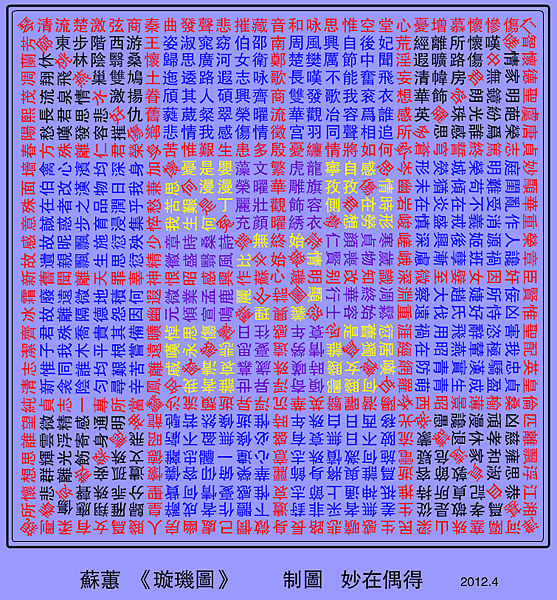 《璇璣圖》為一塊八寸見方的手帕。原圖以紅黃、藍、白、黑、紫。五色絲線織繡,容納八百四十一字,分二十九行排列而成。外圍與內部井字圖案,是紅字,四角縱橫皆六字黑色。上下兩方縱六橫十六和左右兩方縱十三橫六字各為藍色字。井字中心,上下兩方縱四.橫五和左右兩方縱五橫四以及井內中心四角縱橫各三為黃色。縱橫回璇反复逆順讀皆成章句,可組成三、四、五、六、七言詩,共得7,958。