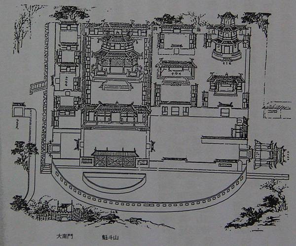 台灣府學宮繪圖,圖下方描繪的門是台灣府城的大南門,旁邊的三峰山是學宮的案山「魁斗山」,中央山峰正對孔子廟。Photo Source:取自<重修台灣各建築圖說>