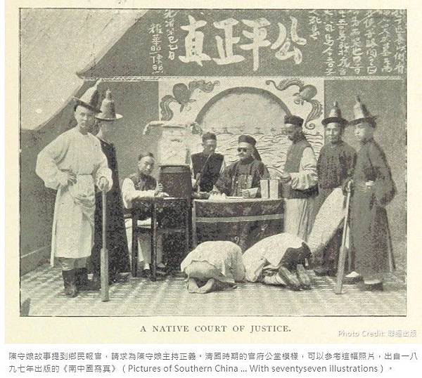 陳守娘故事提到鄉民報官,請求為陳守娘主持正義。清國時期的官府公堂模樣,可以參考這幅照片,出自一八九七年出版的《南中國寫真》(Pictures of Southern China ... With seventyseven illustrations)。