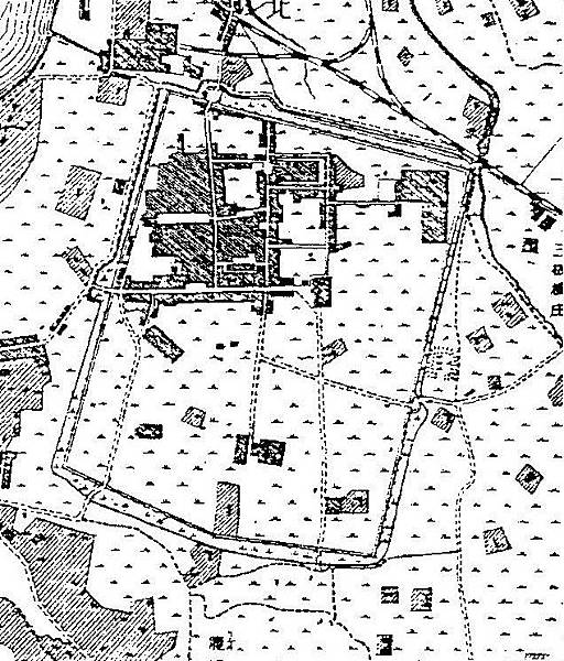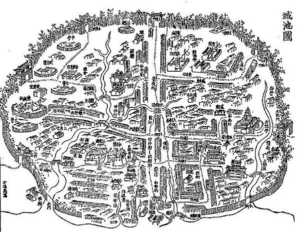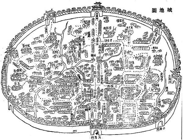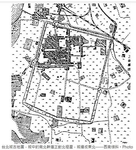 台北城古地圖,城中的南北幹道正對北極星,城牆成東北——西南傾斜。Photo Source:取自台北.都市傳說