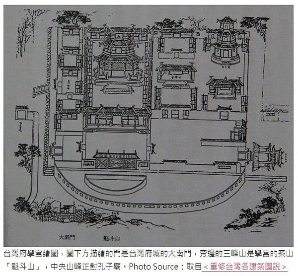 台灣府儒學以魁斗山為案山,《重修台灣縣志》記載「魁斗山在邑城南。其脈自東南來,至正南陡起三峰,狀若三台星,為府學文廟拱案。」台灣府知府蔣元樞在台灣府學宮繪圖中,也詳細畫出案山的位置,圖左下方的城門是大南門,旁邊的三峰山為魁斗山,中央山峰正對著孔子廟。如今到台南依然能走訪「全台首學」孔廟以及府城5城門中僅存的大南門(今稱為寧南門),魁斗山則不再一片荒煙蔓草,整建成了五妃廟。