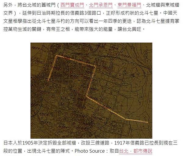 另外,將台北城的舊城門(西門寶成門、北門承恩門、東門景福門、北城牆與東城牆交界),延伸到日治時期拉長的信義路3個路口,正好形成杓狀的北斗七星。中國天文星相學指出從北斗七星斗杓的方向可以看出一年四季的更迭,認為北斗七星據有掌控萬物生滅的關鍵,有帝王之相,能帶來強大的能量,讓台北興旺。