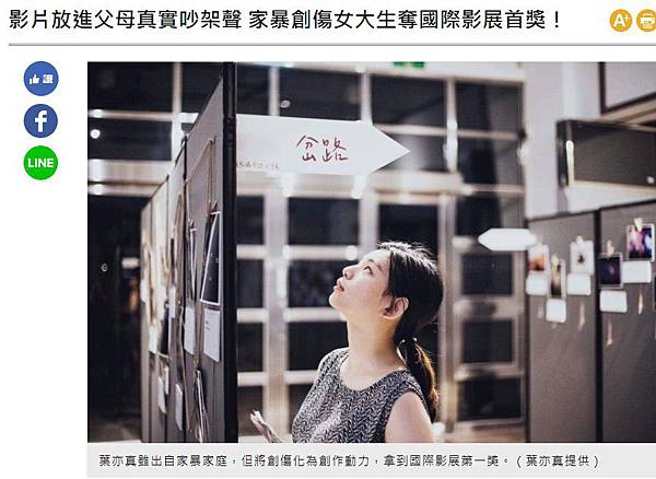 分享影片放進父母真實吵架聲 家暴創傷女大生奪國際影展首獎!到Facebook分享影片放進父母真實吵架聲 家暴創傷女大生奪國際影展首獎!葉亦真雖出自家暴家庭,但將創傷化為創作動力,拿到國際影展第一獎。(葉亦真提供)