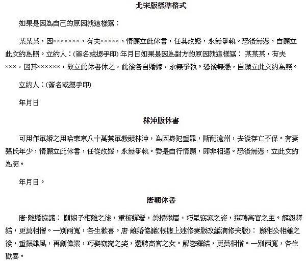 可用作軍婚之用哈 東京八十萬禁軍教頭林沖,為因身犯重罪,斷配滄州,去後存亡不保。有妻張氏年少,情願立此休書,任從改嫁,永無爭執。委是自行情願,即非相逼。恐後無憑,立此文約為照。年月日。