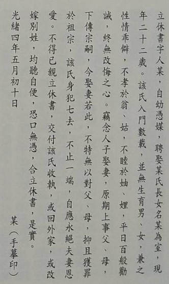 (古代休妻版)立書人蔣德,系襄陽府棗陽縣人,從幼憑媒娉定王氏為妻,豈期過門之後,本婦多有過失,正合七出之條,因念夫妻之情,不忍明言,情願退回本宗,聽憑改嫁,並無異言,休書是實。成化二年 月 日 手掌為記