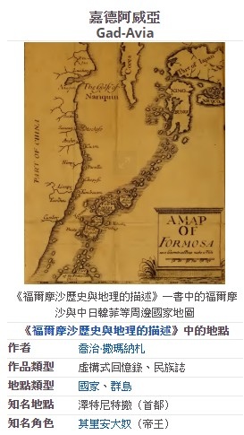 儘管神似金髮碧眼白皮膚的荷蘭人,但撒瑪納札一口咬定,自己出生在遙遠東方島嶼台灣——那是一個由5個小島組成的神秘之地,是清晨的陽光最先降臨之處,首都設在澤特尼特撒。數十年前,一樁陰謀打破了島國的寧靜。一個心機深不可測的中國人,在日本竊奪了皇位,加冕為莫里安大奴天皇,他打起了台灣的主意,「將軍人載入由大象馱的轎籠里,每籠裝三十至四十人」,用翻版的木馬計霸占了撒瑪納札的故土。不過,沒多少人見過惡毒皇帝的真容,與許多東方傳說一致,皇帝是高高在上的神秘角色——「皇帝的腳從不踏在地面上,他也從不讓自己的臉曝於陽光之下。除了貴族,誰也不准去晉見。而接見貴族時,他也是躺在形狀像御座的床上,隔著一層紗羅幕。一般百姓只有在節慶時能看見皇帝,但是瞻仰御容的人必須下跪俯倒叩拜他,然後才准抬頭仰望。」