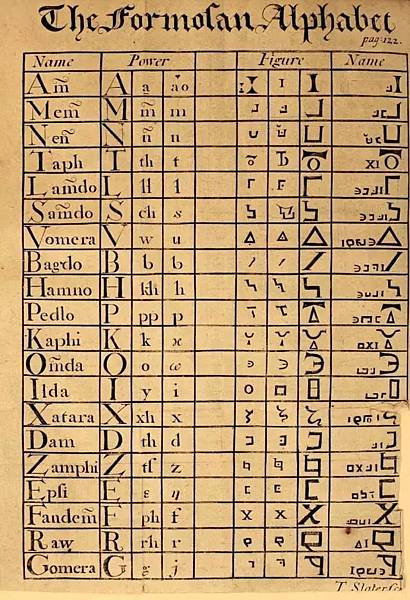 在他的書中,他甚至介紹了福爾摩沙語與其字母,是為人工語言的早期實例。對於創造語言文字這方面,他下足了苦工,讓人信服;即使在他的欺騙行徑被揭穿後,18世紀德國語法學家的著作中仍收錄所謂的「福爾摩沙字母表」。下方是1703年他的宗教翻譯例子《主禱文》: