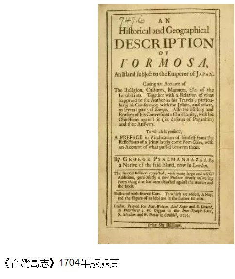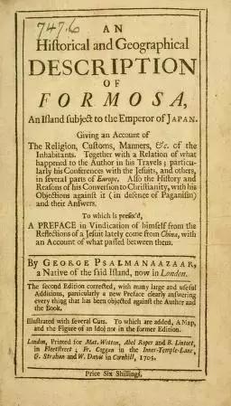 17~18世紀歐洲人 George Psalmanazar(喬治·薩瑪納札) ,趁當時大航海時代歐洲對東方世界的好奇招搖撞騙,自稱是臺灣原住民並虛構了一連串不存在的臺灣風俗文化樣貌,如捏造的社會階級制度、取心臟祭祀習俗、假的貨幣、文字、語言、宗教信仰…等等,薩瑪納札爆紅成為歐洲社交界與知識階級的紅人,並出版了《An Historical and Geographical Description of Formosa, an Island subject to the Emperor of Japan》一書(臺灣的地理與歷史 – 一個日本天皇的島嶼)。