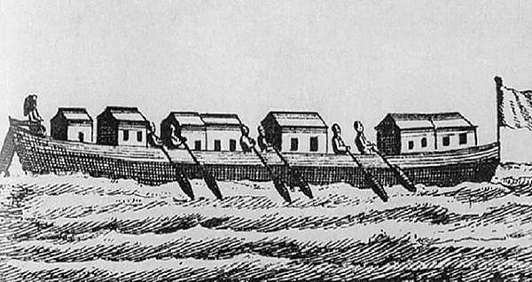 一個台灣浮村。撒瑪納札聲稱這是台灣一種常見生活方式,整個村莊可以划過大海。
