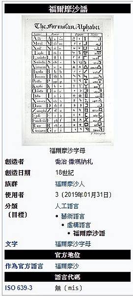 福爾摩沙語是法國人喬治·撒瑪納札於1704年創造的人工語言。根據其著作《福爾摩沙變形記》所述,福爾摩沙語是福爾摩沙的語言,本無文字,後由先知撒瑪納札(Psalmanaazaar)以自稱神賜的字母寫成經文《甲爾哈巴底翁德》(Jarhabadiond),成為福爾摩沙字母的源頭。福爾摩沙語擁有20個字母,而每個字母都有4、5種寫式。[1]