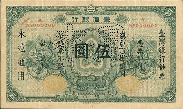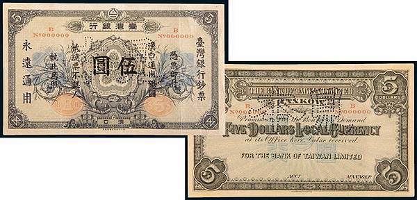 台灣銀行1917年伍圓漢口通用銀圓,樣票,極珍罕,PMG 30。註:1894年中日甲午戰爭爆發,中國戰敗,次年4月,兩國簽訂《馬關條約》中國割讓臺灣.澎湖給日本,使得日本統治臺灣五十年之久,比照日本國內制度,1898年日本在臺灣設立"株式會社臺灣銀行",並發行統一貨幣。1905年1月臺灣銀行在廈門設立分行並發行銀票,之後又在福州.汕頭.上海.九江.漢口設立分行,並發行紙幣,通稱臺灣銀行外地券,發行時間約在1905年至1916年,臺灣銀行外地券在中國內地的流通量不大,因此存世數量相對稀少,十分罕見