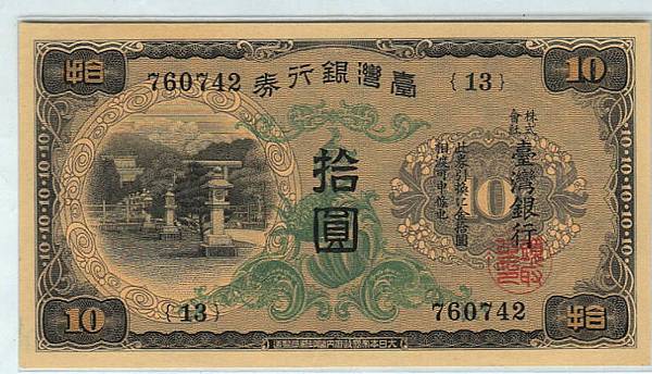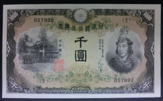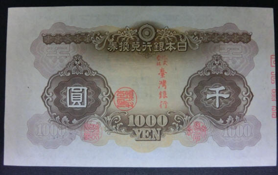 此券由日本武尊千圓券加蓋,只有組號(7)才是台灣銀行券,其他都是日本銀行券-第二次世界末期,昭和20年日本政府為復員需要,由日本國內原行使之日銀千圓券,經東京空運來台北,再經台灣銀行在券反面正中右旁加蓋直書〞株式會社臺灣銀行〞及左旁下圓型〞頭取之印〞章戳,發行流通。