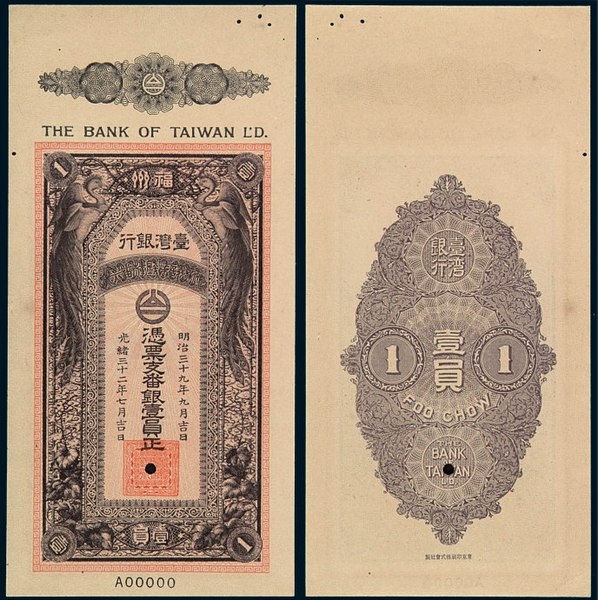 台灣銀行漢口通用銀圓伍圓單正、反樣票各一枚,均打有“見本”註銷孔,極為罕見,背有輕微貼痕,八五成新?相關鏈接:?1894年中日甲午戰爭爆發,中國戰敗。次年4月,兩國簽訂《馬關條約》中國割讓台灣、澎湖給日本,使得日本統治台灣五十年之久。比照日本國內製度,1898年,日本在台灣設立“株式會社台灣銀行”,並發行統一貨幣。?1905年1月,台灣銀行在廈門設立分行並發行銀票。之後又在福州、汕頭、上海、九江、漢口設立分行,並發行紙幣,通稱台灣銀行外地券,發行時間約在1905年至1916年。?雖然台灣銀行信譽良好,但是由於中國人的反日情懷,台灣銀行外地券在中國內地的流通量不大,因此存世數量相對稀少(參見台灣許義宗教授著《台灣貨幣圖說》第55-83頁)