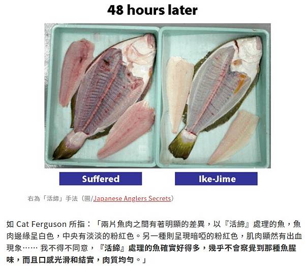 如 Cat Ferguson 所指:「兩片魚肉之間有著明顯的差異,以『活締』處理的魚,魚肉邊緣呈白色,中央有淡淡的粉紅色。另一種則呈現暗啞的粉紅色,肌肉顯然有出血現象…… 我不得不同意,『活締』處理的魚確實好得多,幾乎不會察覺到那種魚腥味,而且口感光滑和結實,肉質均勻。」