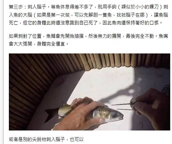 「不管你怎樣看待這種手法,是人道立場也好,與人道無關也好,能夠愈快解脫魚的痛楚,你就能夠吃得愈好。」