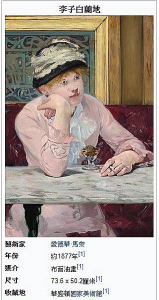 畫中,一位年輕女子,獨自靜坐在咖啡桌前,沒有人知道她是誰。女子胸前放著一杯白蘭地,酒里泡著一枚紫色的李子,和女子一樣孤獨。她頭頂的帽子和袖口的繡花向我們暗示著女子對美的追求,她那一身暖粉色又與其眼神流露出來的寂寥相左。女子一手托腮,仿佛在沉思,另一隻手夾著根香菸。李子和香菸透露了她的內心秘密,這也正是畫家在忖度之後又用畫筆隱晦地描繪出來的:女子手中那根香菸並沒有點燃,她顯然在做一場白日夢;而一枚成熟了的李子浸泡在白蘭地里,孤獨地沉醉下去,期待著有人來將她一飲而盡。https://is.gd/FMQHwf