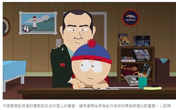 中國軍官對屎蛋的電影腳本做物理上的審查,讓屎蛋開始思考創作自由和賺錢哪邊比較重要。(翻攝 southpark.cc.com)
