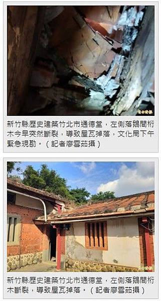 新竹縣歷史建築竹北市通德堂,左側落鵝間桁木斷裂,導致屋瓦掉落。(記者廖雪茹攝)
