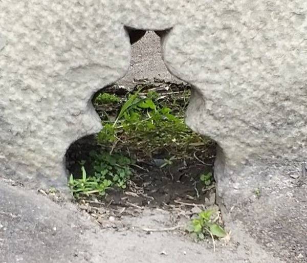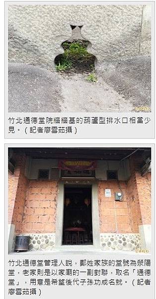竹北通德堂院牆牆基的葫蘆型排水口相當少見。(記者廖雪茹攝)