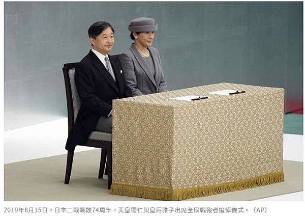 2019年8月15日,日本二戰戰敗74周年,天皇德仁與皇后雅子出席全國戰歿者追悼儀式。(AP)