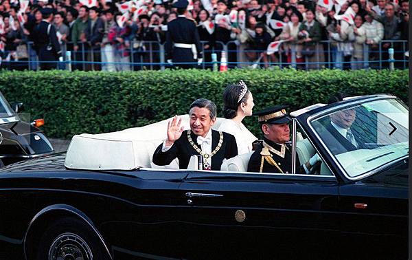 天皇陛下(當時)在即位之禮的祝賀巡遊活動中向沿途的民眾揮手致意,1990年11月12日,東京青山大道(時事)
