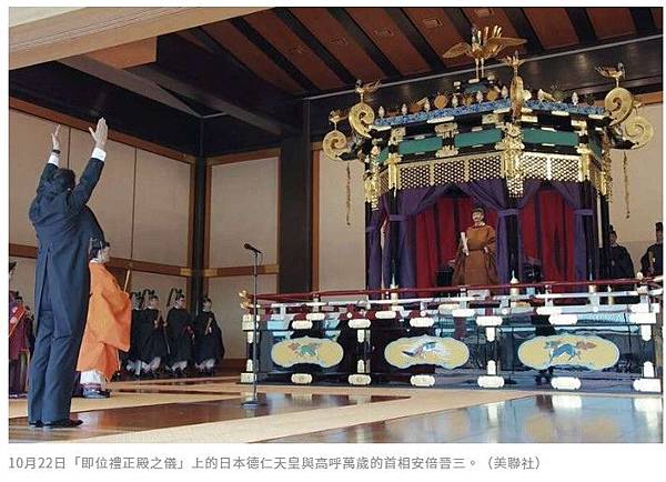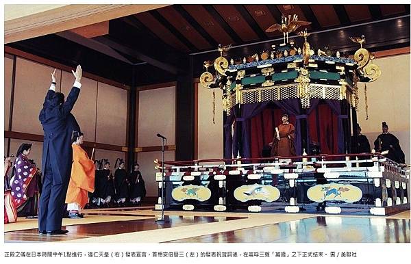 德仁在這場儀式上首度以日皇身分說話,安倍也會代表國民問候德仁。這場儀式預估進行約10分鐘。