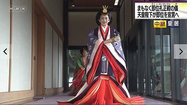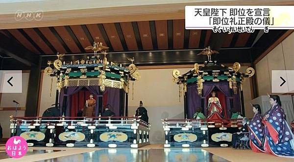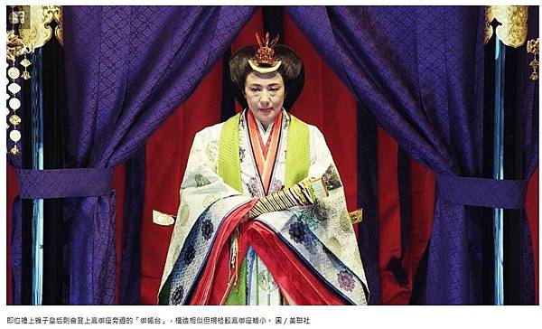 身著天皇專用束帶(平安時代以後天皇和宮家的正裝)的天皇陛下將登上「高御座」,發表宣告即位的講話。高御座意味著天皇的寶座,從平安時代的即位儀式開始,一直沿用至今。現在使用的高御座是1915年為大正天皇舉行即位之禮而新造的,高6.5公尺,重8噸。而身著十二單(日本公家女子傳統服飾中最正式的一種——譯注)的皇后陛下將登上旁邊尺寸小一圈的御帳臺。其他成年皇族成員也將身著平安時代的服裝集體亮相。