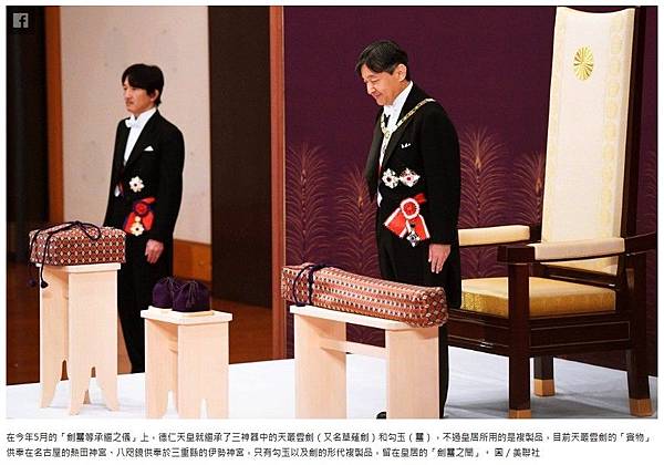 在今年5月的「劍璽等承繼之儀」上,德仁天皇就繼承了三神器中的天叢雲劍(又名草薙劍)和勾玉(璽),不過皇居所用的是複製品,目前天叢雲劍的「實物」供奉在名古屋的熱田神宮、八咫鏡供奉於三重縣的伊勢神宮,只有勾玉以及劍的形代複製品,留在皇居的「劍璽之間」。