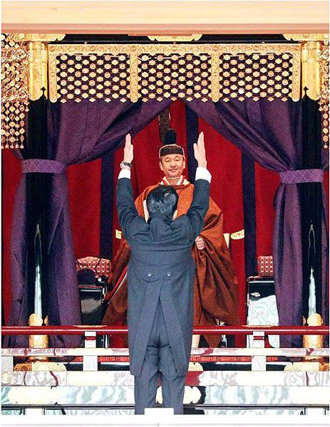 經政府和宮內廳討論研究,最後決定讓時任首相的海部俊樹身著作為國事行為的儀式的標準服裝燕尾服,留在上皇陛下所在的「松之間」內,呼喊「恭祝即位,天皇陛下萬歲」。這樣一來,呼喊「萬歲」的宗旨就明確了。安倍首相大概也會效仿前例。