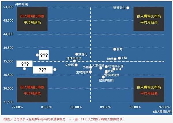 從圖中可以發現,投入職場比率和薪資都較高的有「醫藥衛生學群」、「教育學群」、「工程學群」及「財經學群」;其中,由於醫學相關科系的人才養成需投注較高的精力、時間與花費,再加上可替代性低,在起薪上高居第一可說是實至名歸。