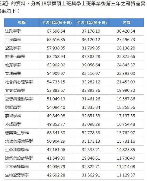 但是要注意,這些數字並不完全代表學歷的加值性,因為這是調查學士班及碩士班畢業後第三年的平均薪資,有不少碩士生並不是在大學畢業後便直接就讀碩士班,可能已經先有幾年的工作經驗才回到學校進修,因此碩士班的薪資除了受到學歷的加值性影響外,也可能受到「工作經驗」與「人格特質成熟度」的影響。