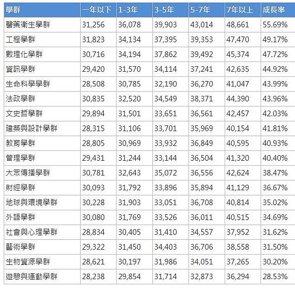 結果顯示,比較一年以下與七年以上的平均薪資,以「醫藥衛生學群」的薪資成長速度最快,高達55.69%,其次則是工程學群;而成長速度最慢的則是「遊憩與運動學群」,只有28.53%。