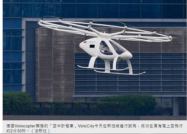 〔中央社〕德國Volocopter開發的「空中計程車」VoloCity今天在新加坡進行試飛,成功在濱海灣(Marina Bay)上空飛行約2分30秒。公司表示,拿下新加坡市場後,將續攻其他亞洲城市。