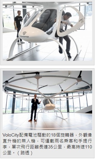VoloCity配備電池驅動的18個旋轉器,外觀像直升機的無人機,可運載兩名乘客和手提行李,單次飛行距離長達35公里,最高時速110公里。(路透)