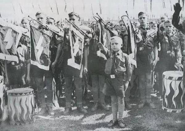 ▲希特勒少年團團員正在向檢閱者行以納粹禮致意,其上一級即是希特勒青年團。