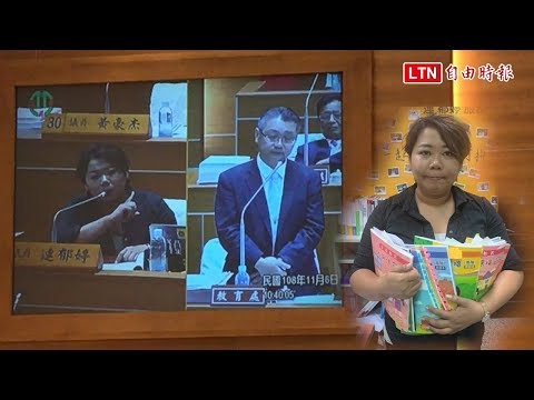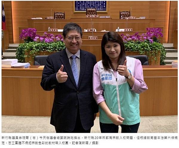 新竹縣議員余筱菁(右)今天在議會總質詢時她指出,新竹縣20年來都有宗教入校問題,但根據教育基本法第六條規定,志工團體不得把宗教色彩的教材帶入校園。記者陳斯穎/攝影