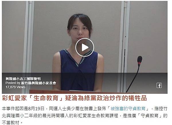 彩虹愛家 「生命教育」被同運陣營攻擊,本事件延燒快一個月,連支持同婚的志工媽媽都被鬥到哽咽,泣訴將暫停興隆國小晨光時間的入班活動。「新竹縣立興隆國小生命教育志工團隊」昨(9)發表聲明表示,「身為興隆的家長與志工的我們,近來備受煎熬與痛心,完全不希望興隆國小莫名無辜變成網路上的爭論戰場。」為了保護學校和孩子,生命教育志工決定暫停晨光進班,「不願看到學校和志工們繼續被汙衊。」 彩虹愛家 不堪政治打壓 團長哽咽:暫停興隆國小晨光時間入班 http://bit.ly/32aHNUC