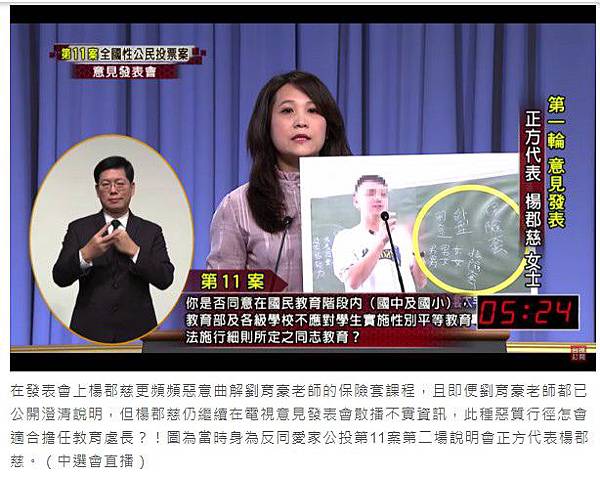 在發表會上楊郡慈更頻頻惡意曲解劉育豪老師的保險套課程,且即便劉育豪老師都已公開澄清說明,但楊郡慈仍繼續在電視意見發表會散播不實資訊,此種惡質行徑怎會適合擔任教育處長?!圖為當時身為反同愛家公投第11案第二場說明會正方代表楊郡慈。(中選會直播)