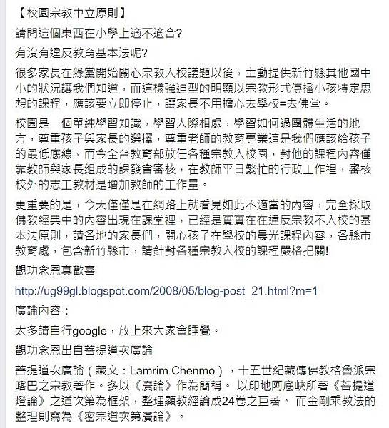 校園是一個單純學習知識,學習人際相處,學習如何過團體生活的地方,尊重孩子與家長的選擇,尊重老師的教育專業這是我們應該給孩子的最低底線。而今全台教育部放任各種宗教入校園,對他的課程內容僅靠教師與家長組成的課發會審核,在教師平日繁忙的行政工作裡,審核校外的志工教材是增加教師的工作量-更重要的是,今天僅僅是在網路上就看見如此不適當的內容,完全採取佛教經典中的內容出現在課堂裡,已經是實實在在違反宗教不入校的基本法原則,請各地的家長們,關心孩子在學校的晨光課程內容,各縣市教育處,包含新竹縣市,請針對各種宗教入校的課程嚴格把關!