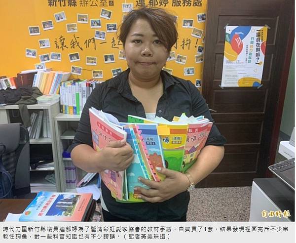 為此,我們時代力量新竹縣黨部特別買來了整套有公開販售的教材,讓辦公室同仁與幾個認識的媽媽們一起,仔細翻閱了每一頁教材,並在這次的定期會質詢中,提出明顯不適合在公立中小學教授的內容。