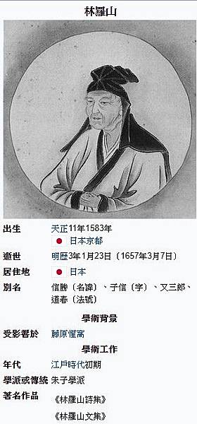 林羅山1583年-1657年日本江戶時代初期的儒學家。出家後法號道春。1605年以二十三歲的年輕少年身份,成為德川的智庫。幕府的相關政治、公文文書起草他多有參與。德川家康重用儒家學者/政治上主張“君君、臣臣、父父、子子”的綱紀之道,在社會上推行“天子、諸侯、卿大夫、士、庶人”的“五倫”