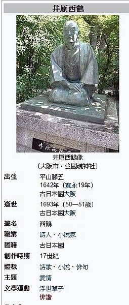 活躍於江戶時期的難波(即今大阪)才人井原西鶴(1642-1693),是自紫式部(約937-約1014,《源氏物語》的作者)以來日本最偉大的小說家。