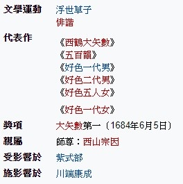 其小說《好色一代男》仿效前輩紫式部的《源氏物語》而作,真切表現了浮世世態和人間愛欲。[1] 他獨創了文學體裁「浮世草子」,從而促使町人文學的誕生,被譽為「日本近代文學大師」。[1]